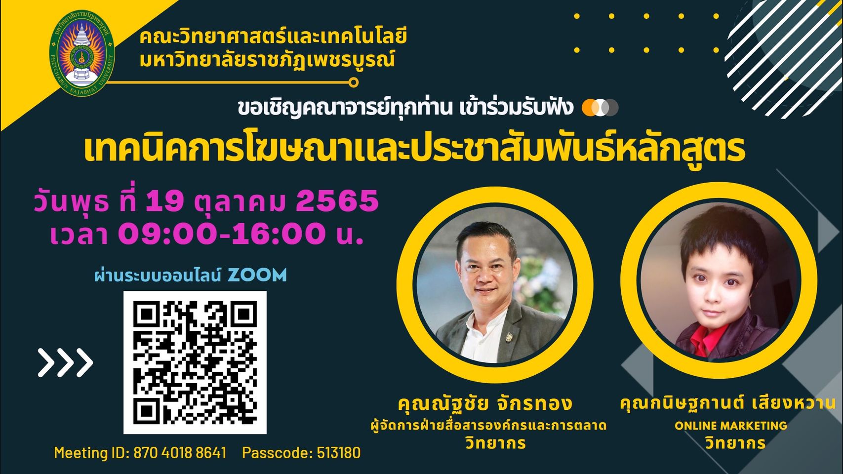 วันพุธที่ 19 ตุลาคม 2565 เวลา 09:00 น. คณะวิทยาศาสตร์และเทคโนโลยี ได้ดำเนินโครงการอบรมเชิงปฏิบัติการ เรื่อง เทคนิคการโฆษณาและประชาสัมพันธ์หลักสูตร (ออนไลน์) ให้คณาจารย์ เพื่อให้คณาจารย์มีการเตรียมความพร้อมการรับสมัครนักศึกษา ได้ทราบถึงเทคนิคการเตรียมข้อมู