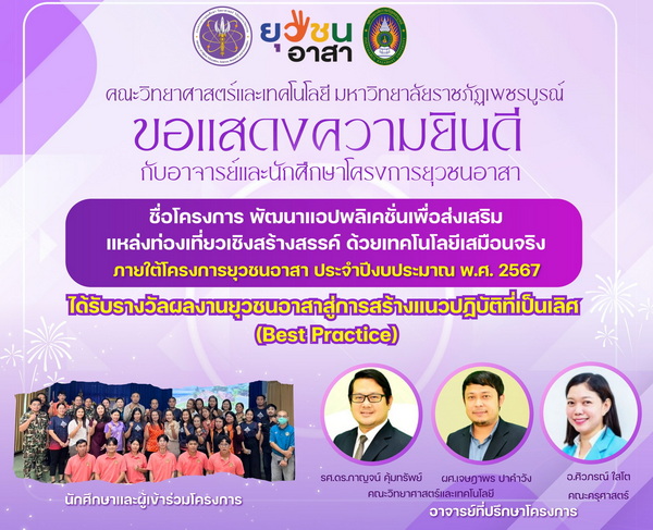 คณะวิทยาศาสตร์และเทคโนโลยี มหาวิทยาลัยราชภัฏเพชรบูรณ์ ขอแสดงความยินดีกับอาจารย์ที่ปรึกษาและนักศึกษาผู้เข้าร่วม โครงการยุวชนอาสา ประจำปีงบประมาณ พ.ศ. 2567