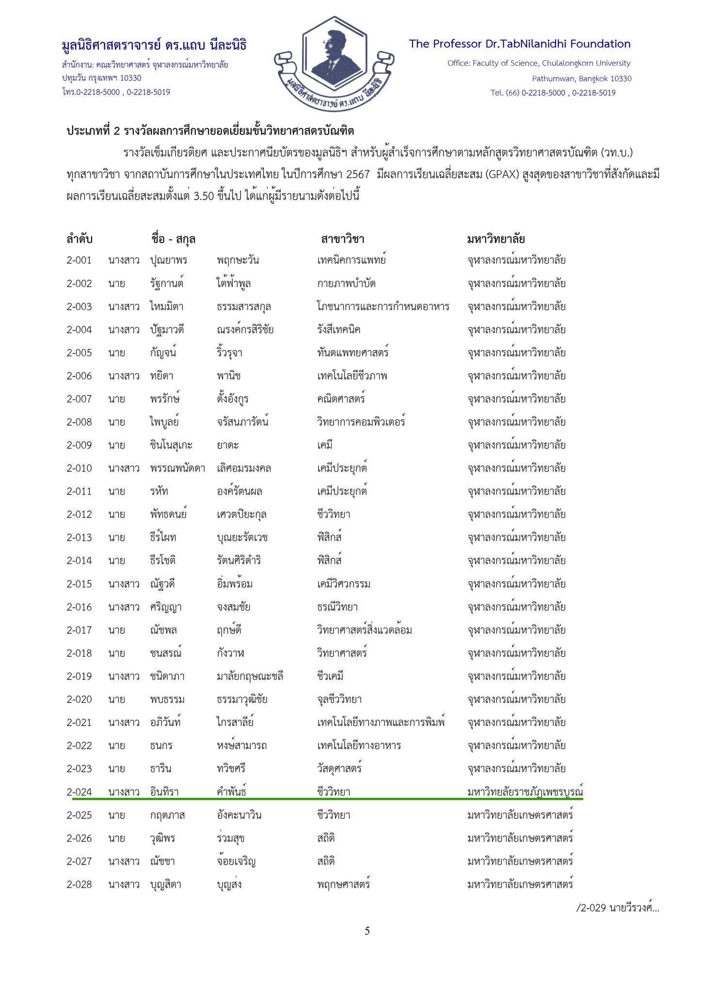 รางวัลเข็มเกียรติยศและประกาศนียบัตร สำหรับนิสิต/นักศึกษาสายวิทยาศาสตร์ทุกสาขาวิชาในประเทศไทย ชั้นปีที่ 1 ปีการศึกษา 2567