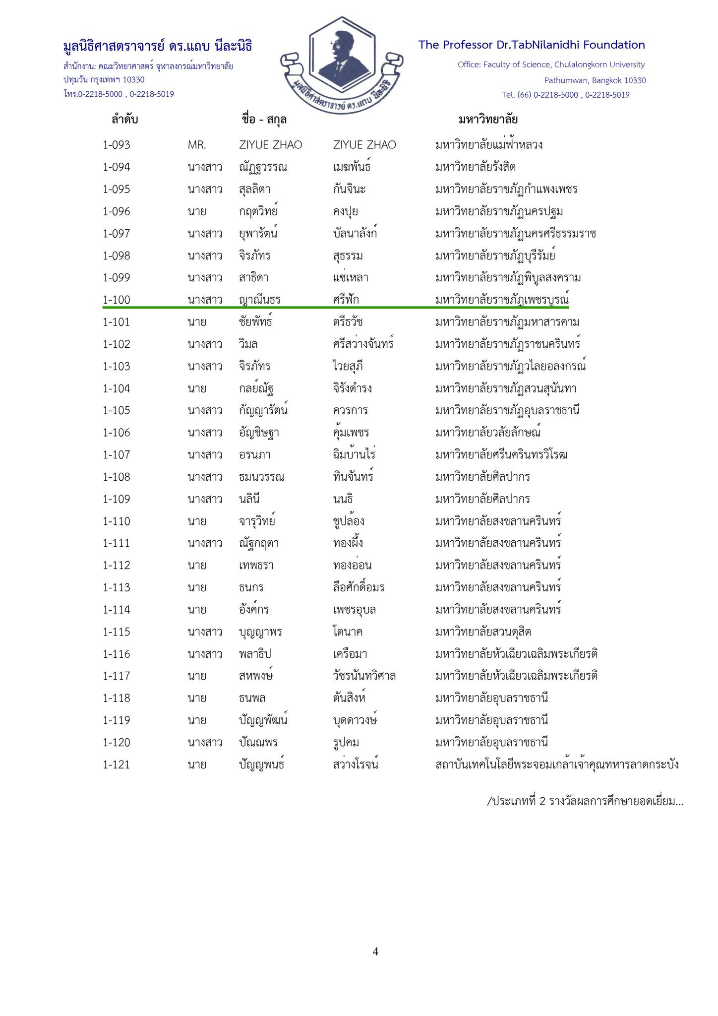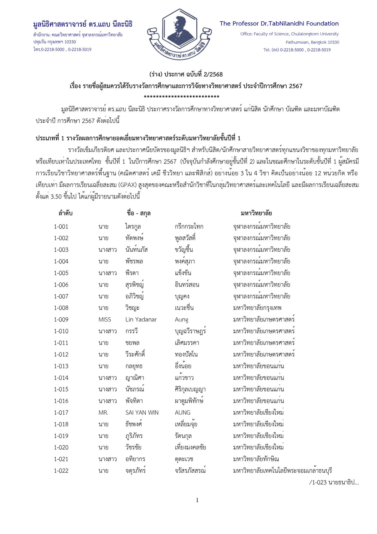 ประเภทที่ 1 : รางวัลผลการศึกษายอดเยี่ยมทางวิทยาศาสตร์ระดับมหาวิทยาลัย ชั้นปีที่ 1